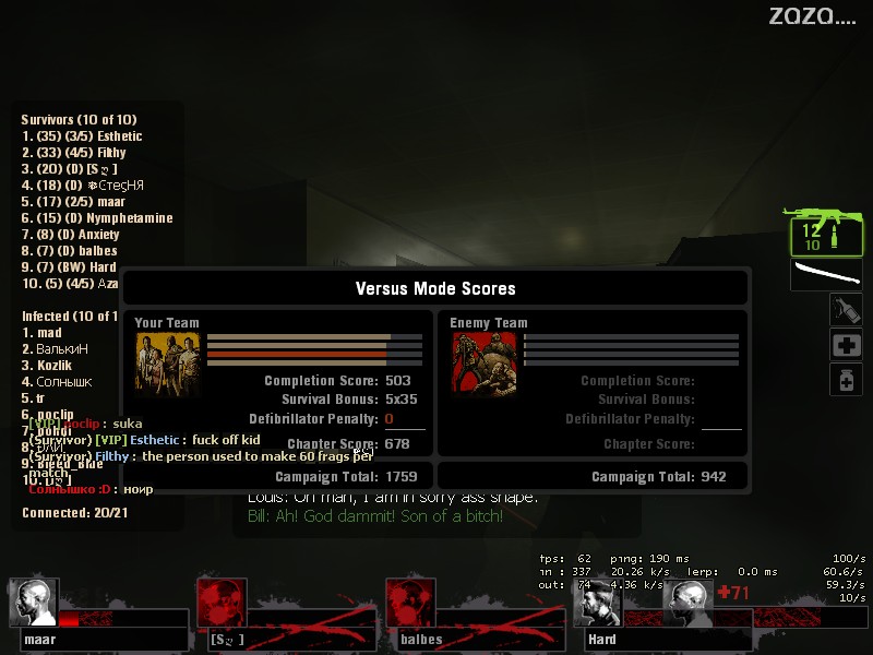 Lol.Here you dogs started barking again.Order them to calm down i will give them something to eat,don't worry.And ya , look at the screenshots that you have posted ,there is a very big difference of frags between you and the players on the 2nd position.But yesterday i did not see anything like this.Maybe you joined without your mods.Who knows.Talking about the screenshot that i posted was to prove your without addons performance.Not to show my 33 frags.By the way,why did you rage-quit????Abusing me.It does not make sense.if you can't leave a person far behind from you in frags then start abusing him or start a vk against him.that's what noobs like you can do.So fuck off and never try to call me a hacker.Talking about your dogs i can fuck them at anytime at anyplace.