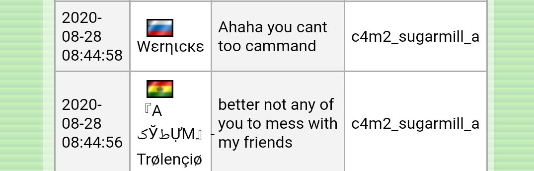 Испанцы совсем попутали.Сервер Мутация Танки.Кикают русских из-за расизма.Обзывают русских мусором и ставят на кик,если один русский в команде испанцев.Эти игроки угрожают киком и кикают: https://stats.zozo.gg/hlstats.php?mode=playerinfo&player=2236999 и https://stats.zozo.gg/hlstats.php?mode=playerinfo&player=1847042