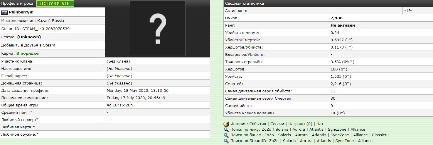 А насчет бана на синкзоне - я смотрела демку, не за что там было банить. Произошёл конфликт с постоянными игроками, один из них оказался корешом админа. А последний был видимо в запое.