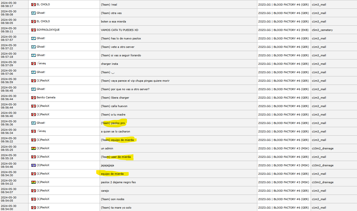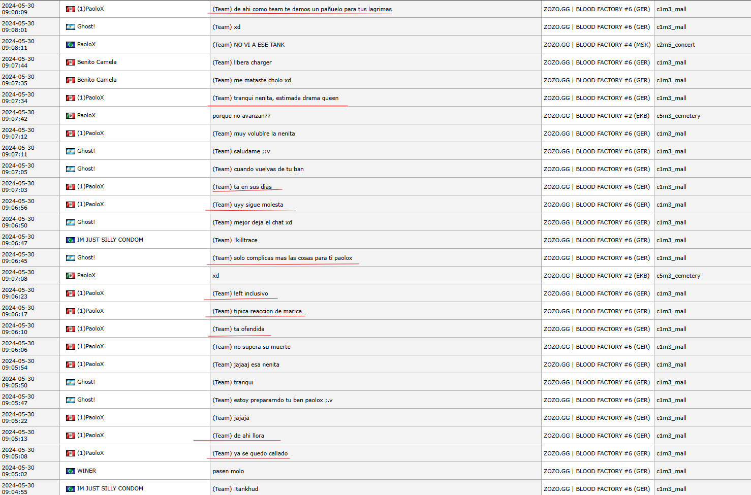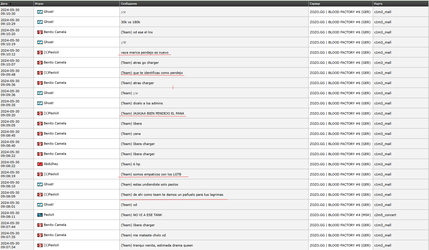 Hello, how are you doing! I don't know if it's the right yarn but since.. last night on Factory server #6. The player. Paolox after the team did not respond as he wanted started insulting the team and a player named User. Because he was holding up charger. I suggested that he go to another server (maybe not in the best way but I did) and instead of doing so, he started to take it out on me by insulting me, shooting me and for some strange reason, making comments Derogatory towards the LGBT community, with whom I somehow strangely relate and attack myself, as seen in the chat log and the demo. For obvious reasons, you may not understand it, but top players in South America will confirm without any problem the obvious toxicity with which this player seems to play. Attached screenshots and links.