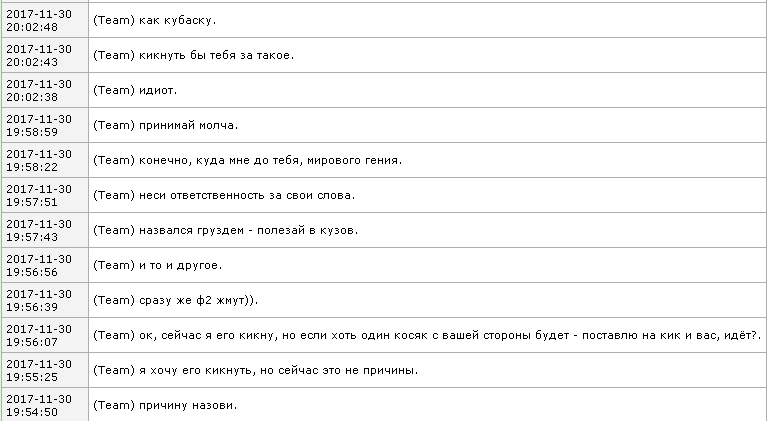 Люди, да что с вами такое, а???? За глаза все такие херои шо мама дорохая! У нас ток Вудман в глаза говорит, а у остальных что мозгов хватило только на задворках пятки кусать??? Вудмана люблю только за то что он в глаза говорит и не кикает чувака понимающего русскую речь (к мамету не относится) пыжется учит как играть, и потом если не понимает ставит на Кик. Вы же ни объяснить правила ни прописать !см не в состоянии!? Как бабки на лавочке по беседками срете всех.