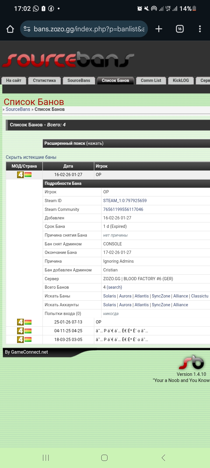 Подозрения Администратора Cristian на твой счёт оказались не напрасны, поскольку твой текущий игровой аккаунт ★ P ᴀ ᴅ ʀ ɪ ɴ o ★ [#] является твоим более поздним аккаунтом, в то время как на одном из твоих ранних аккаунтов — "Omar PlataQuiero presentar queja del administrador Cristian cada vez q entro al juego me banea sin razon alguna