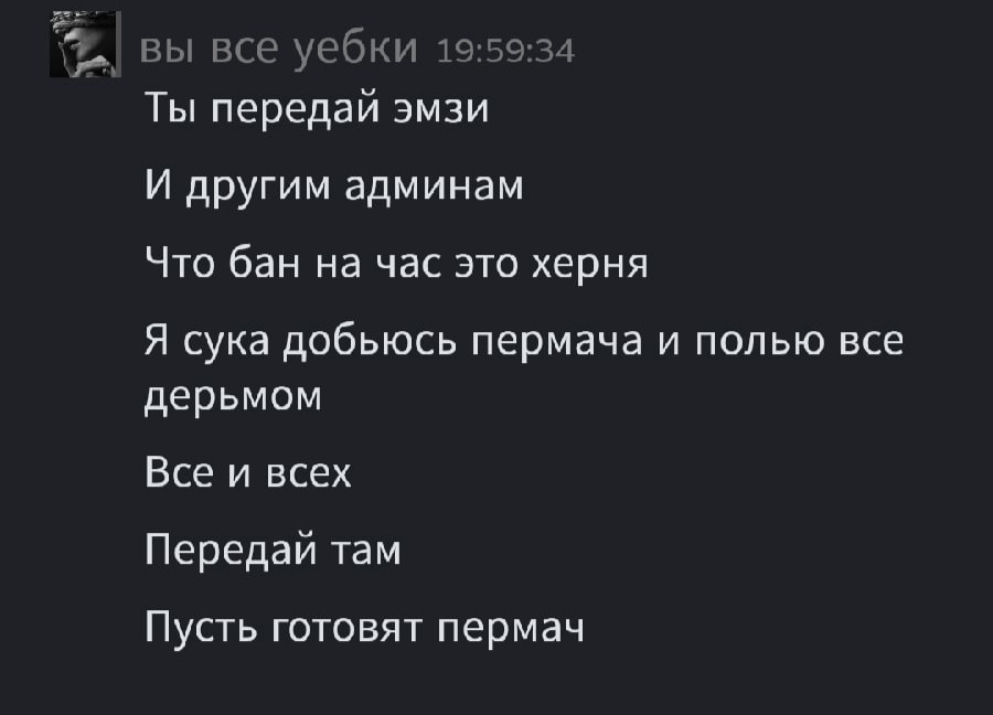 P.S я стараюсь никогда ни с кем не конфликтовать (это моя первая жалоба за 3 года, потому что просто хотел отыграть любимую компанию, зашел вечером после работы, отдохнуть, а тут необоснованный бан, как и твоё сообщение))