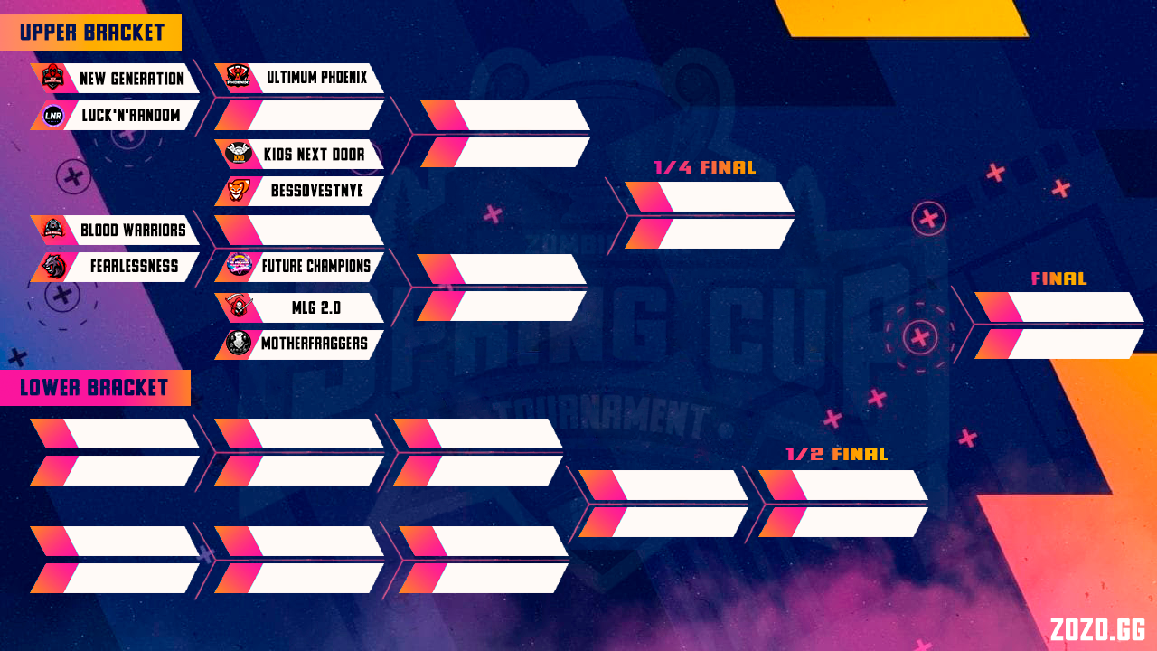 Жеребьевка успешно проведена, команды распределены. Команды Luck'n'Random и New Generation открывают турнир. Игра назначена на 1 мая На сервере Blood Factory 5. Время я уточню уже с капитанами. 2 игра состоится 2 мая между командами Blood Warriors и Fearlessness на сервере Blood Factory 3. Капитанам этих команд прошу определиться со временем проведения и картами. Всю информацию докладывайте в Discord на канале "ZoZo Captains room"