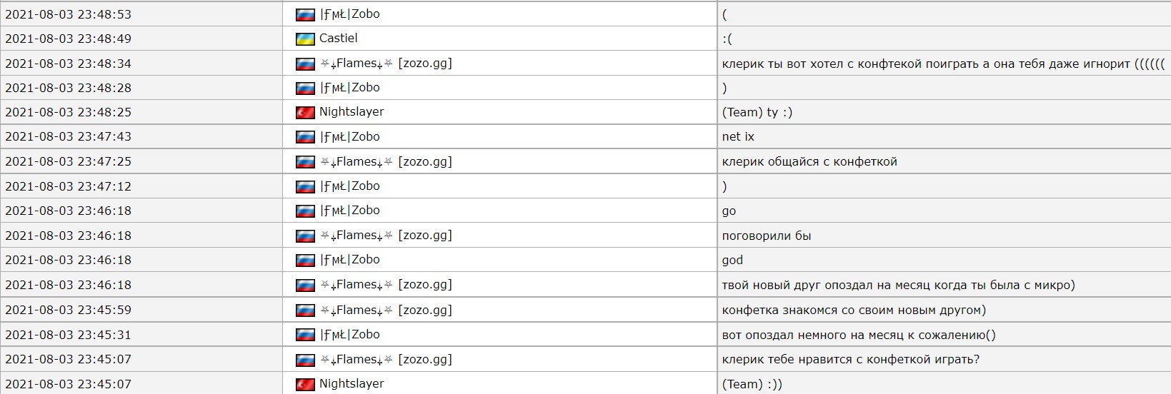 Все что ты отправил было давно, сейчас у Flames и Конфеты возможность писать в чате отсутсвует