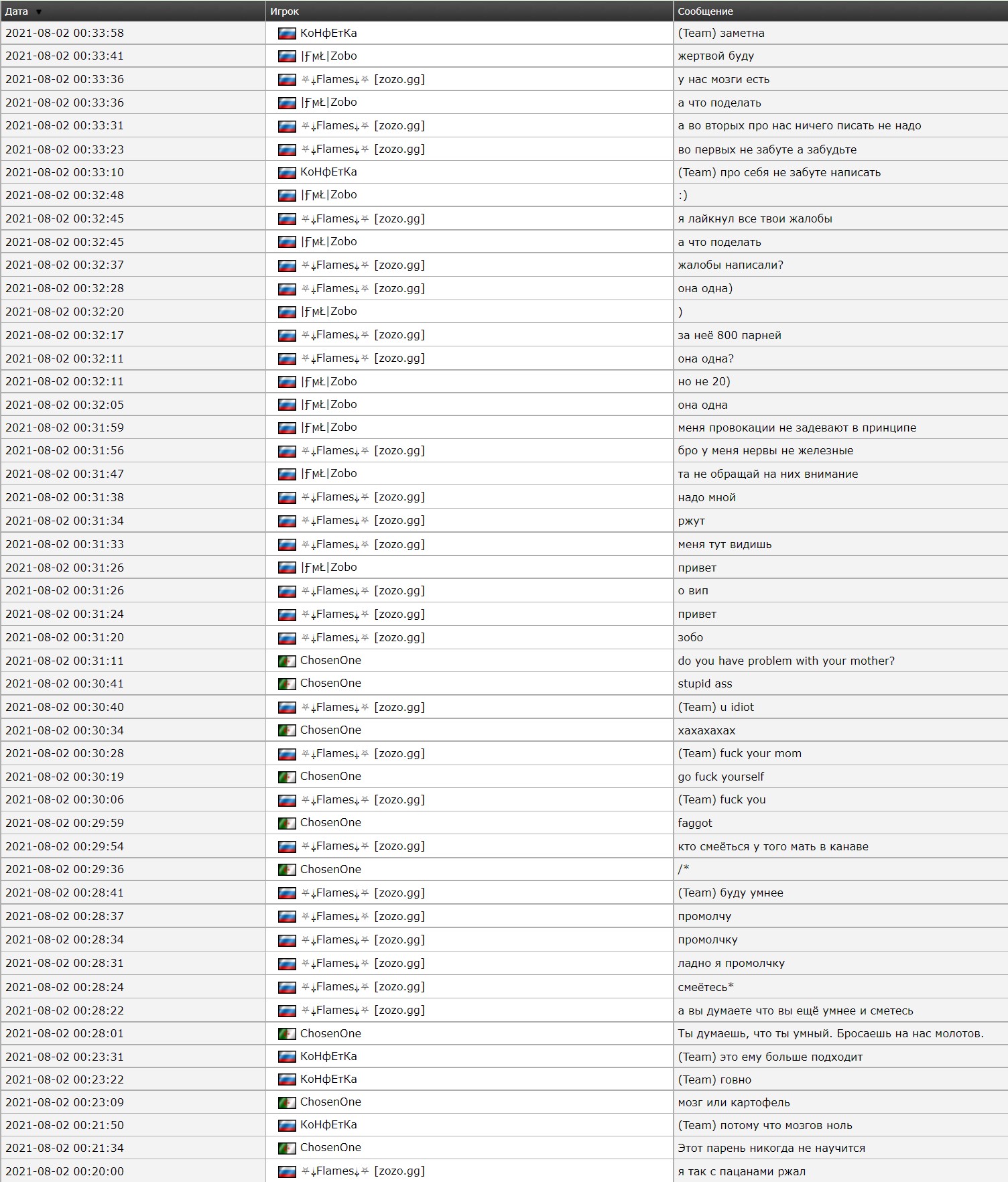 - Здравствуйте ChosenOne, я поддерживаю вас в этой ситуации, действительно непонятно, что происходит в игре, я давно это наблюдаю и большая агрессия по отношению к этому игроку конфетка, игроки придираются к ней абсолютно во всем, одни и те же игроки постоянно ее оскорбляют, все это вы можете увидеть в чате, и на демоверсии которых я уже предоставил ранний админский спумер ..