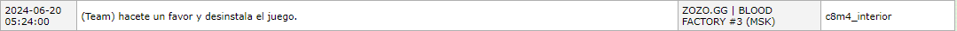 Replying to my colleague @VROXD97. It is not new that this player is a farmer so to speak, constantly retaining the infected mainly like the Spitter and the Smoker and giving types of warnings or threats about wanting to kill players either towards me or also to my low-ranking colleagues or also in a few terms to the (Paoloxs), the types of insults that this player uses are also stressful, ruining the experience of the players and myself, I am aware that sometimes it happens to me too but not excessively repeatedly like this player @GHOST ! He tends to do it many times and as you can see in my colleague's tests, you can see exactly the offensive words and insults he uses. I agree with my colleague that his prohibition is to have his rank permanently removed or excluded from the classification table, because For this user it is already customary to always do the type of things that are shown in the clips, I have nothing more to say and if I had proof I would really be happy to also give me the time to upload them but unfortunately I just put up with it so as not to cause more problems So I'm not the only one who this player harasses and each of those involved will pass their opinion for having ruined their gaming experiences on the zozo.gg server in the same way towards that individual.Ghost! | HLX | Steam ID: STEAM_1:0:763907265