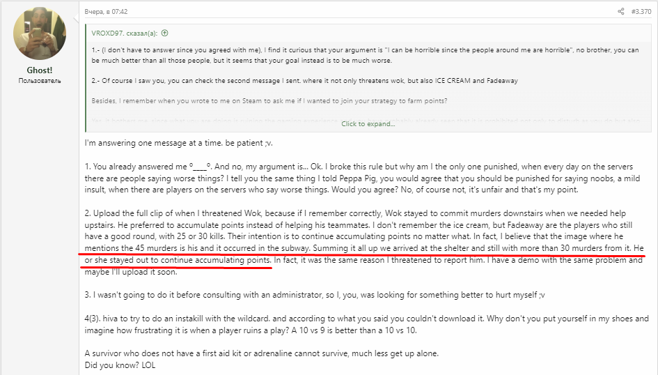 I wanna publish evidence of the lies of ghost. I also wanna this message to be read by every reader, AT LEAST CONCLUSION. Initially, this guy accused me of farming and ruining the game for other players. I asked him to post demo or some evidence of exactly how I farmed and ruined the game for other players (Or at least his detailed verbal version of what happened, note that I asked him for this several times). To which this guy said that he didnt remember anything, he have not any evidence, but he was sure that I was 100% farmed. And he also added that he did not want to discuss this topic. It turns out that you allowed yourself to insult person idiot farmer? And now youre telling me to just forget it? Nah, I dont wanna forget it. I wanna you to answer for your words. In general, it seems to me that you allow yourself too much in the game and in this topic.