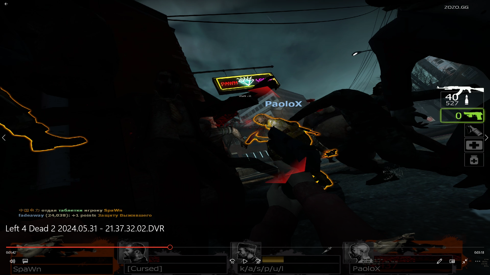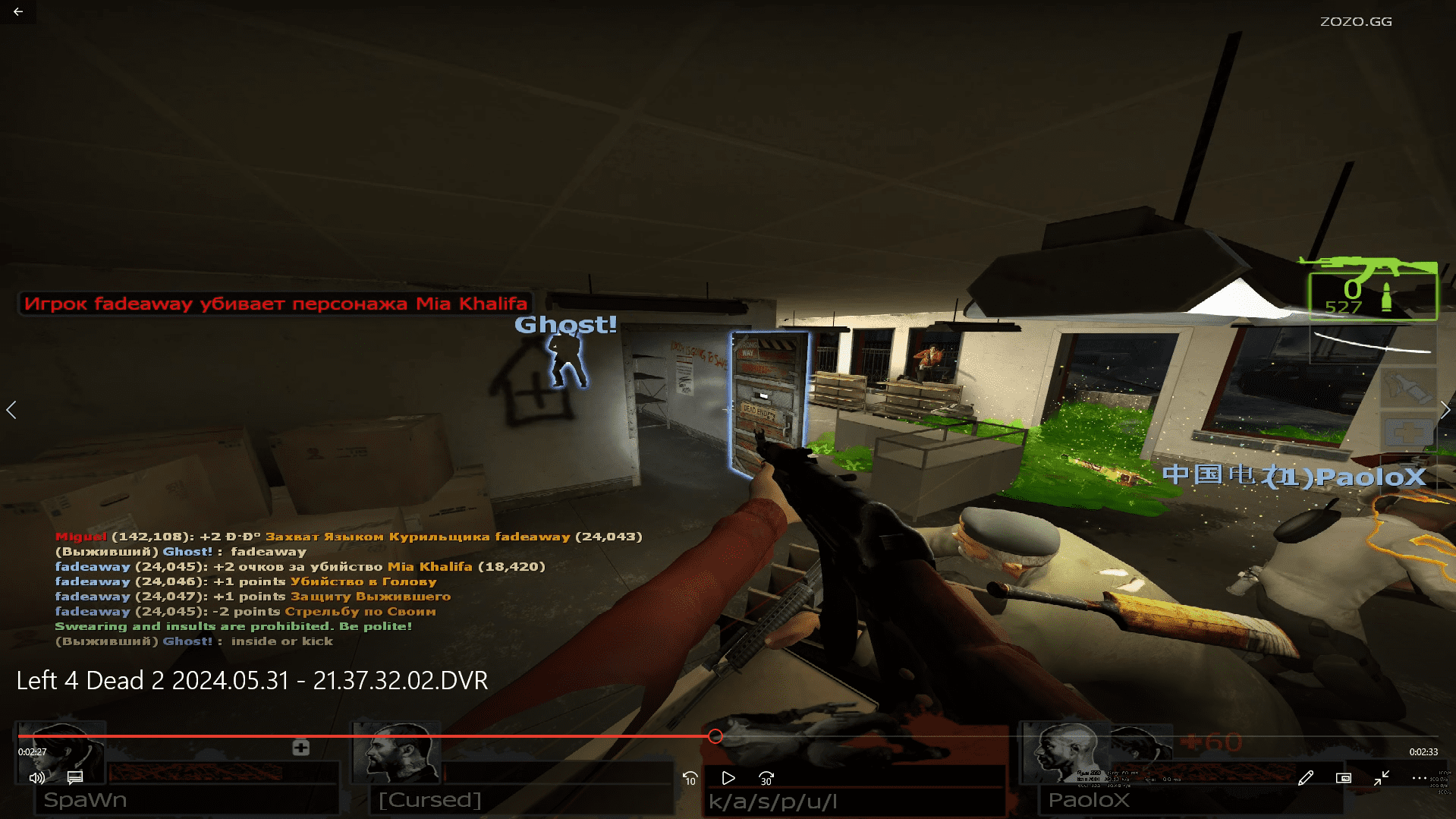 2) Okay, lets check you report against fadeaway&pochi . Your video clearly shows that we are not standing for one place and are moving towards saferoom. We slightly slowed at the end because the respawn space opened up. Accordingly due to the opened space for the infected, attack began on us. We are in vomiting, commons surrounded and blocked us, and on top of this we are under attack from special infected that fly out on us using rocketspawns. While in vomiting, I cant see where my mates are, I also cant see what happening around me, Im disoriented. Explain me how, we were supposed to move in this state? It is obvious that the chargers (which are even visible in your video) will try to drop us. To prevent this, you need to move as far away as possible, kill mobs and all special infected. In other words, repel attack. Even if there were no mobs that prevented us from physically moving and blocked us, but only a crowd of special infections that rocket spawned behind us, it would be very stupid to ignore this and just go for +w in saferoom (seems probably only you would do that and in a few seconds would have dropped by a charger). Idk why I explain this to “god” of zozo. You are a strong player who controls your teammates, so you must understand this. But if you saw farming here, it tells us the opposite.