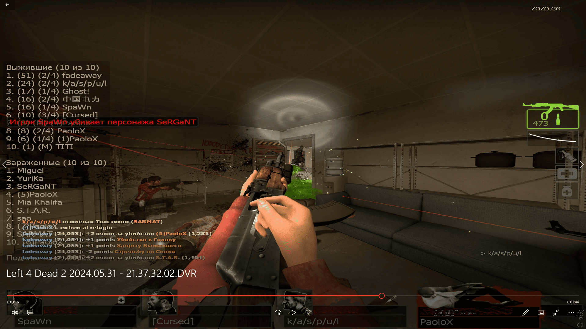 5) 0:53. Idk where you saw me standing on one place. Your video perfectly shows me going to the safe room. I even turn my back to those places where infected could potentially spawn lmao. Probably only our zozo god is capable of killing by his back xDDD.