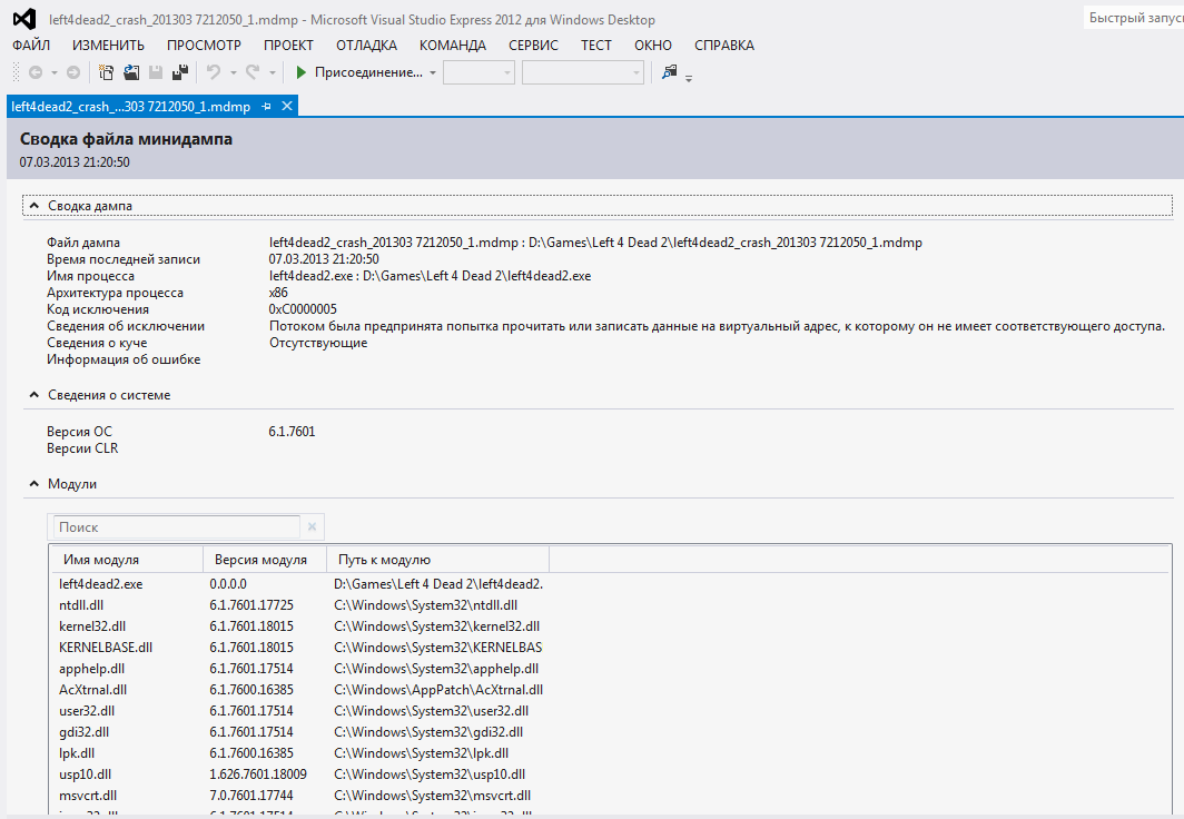 Ребят помогите пожалуйста,конкретно крашит игру,захожу и сек через 20 выкидывает,это ужасно.Поиграть не могу но хочу,кстати заметил что все игры полетели,сегодня утром поменял язык на Left 4 Dead 2 на английский и поиграть чуть чуть,вышел - ушел - прихожу на работает.Как показал спумер на видео,у меня не работает,по разному пробывал,да и ещё в папке с игрой остается "left4dead2_crash_201303 8194021_1"вот такие файлы формата mdmp!