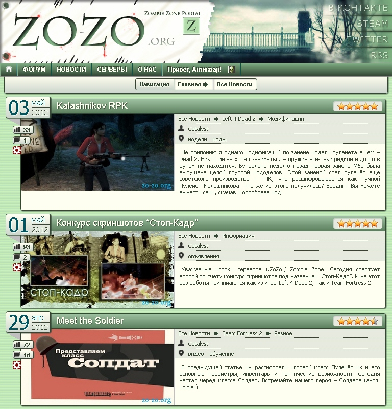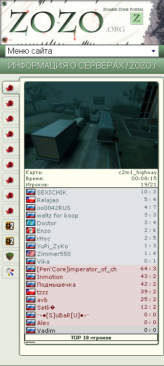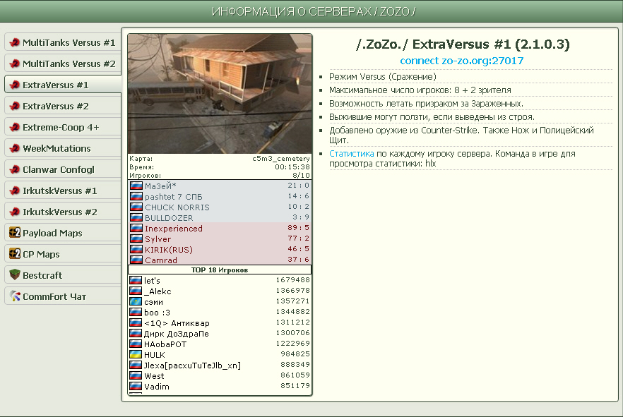 Для удобства просмотра всех серверов /.ZoZo./ Zombie Zone вкладки на главной странице расположены вертикально, что позволило вместить мониторинги и описания всех серверов.