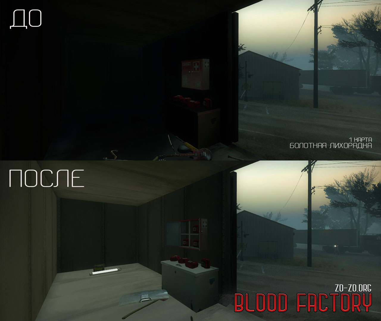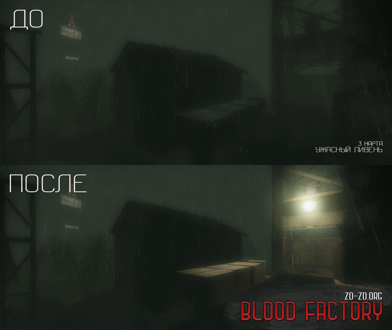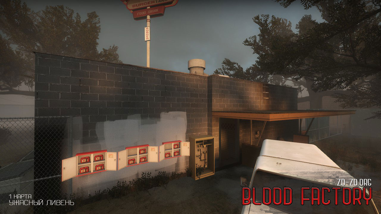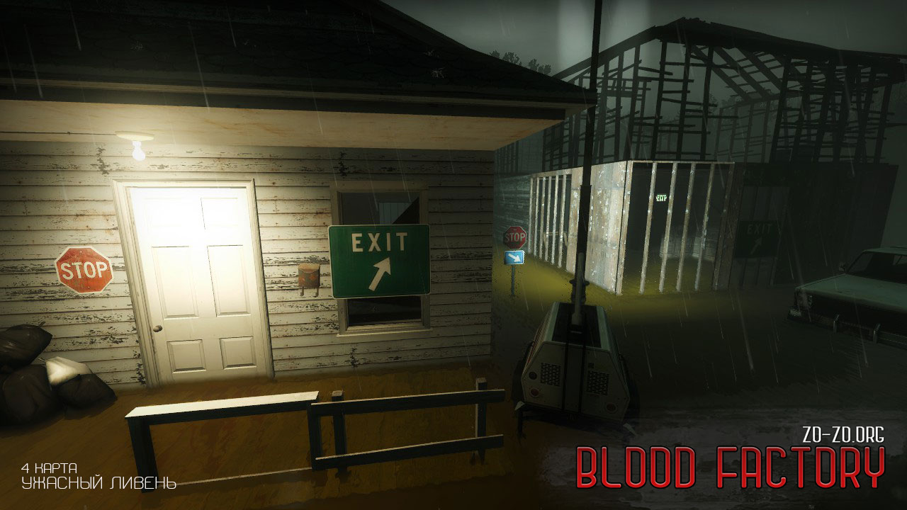 - На 1 карте Жуткого ливня аптеки и оружие размещены перед входом в здание, чтобы можно было взять всё необходимое до начала игры; слегка удлинен путь прохождения; добавлены указатели направления движения для новичков.