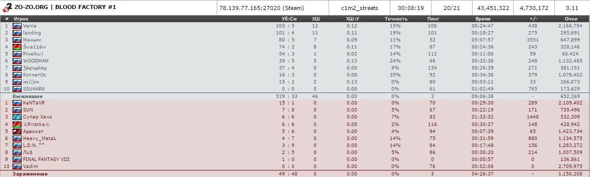 Результат изменений. Субботний вечер. Первый сервер Blood Factory. У всех игроков высокий ранг.