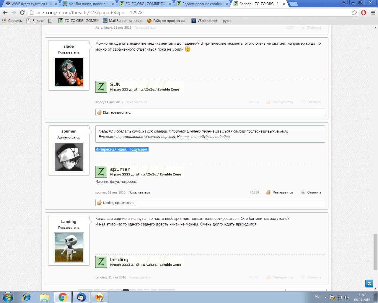 В своё время мы с Каталистом были теми, кто вынес предложение блокировать двери и ставить заборы до начала раундов, поскольку первые законнектившиеся хватали оружие и не дожидаясь остальных начинали игру. Вот тогда ты обоснований не просил, поскольку и сам играл чаще и видел необходимость данных мер. Сейчас ситуация примерно та же - игру начинают самоубийцы, таймер на блок дверей сбрасывается, но сами двери остаются заблокированными, приходится держать оборону на минусовых местах.