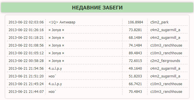 4. При успешном голосовании за одиночные забеги, они активируются, участниками становятся игроки, которые были согласны участвовать. Всех перемещает в зрители, а затем по очереди каждый пробегает на время от начала и до конца карты. Когда все участники пробежали, объявляются общие результаты и определяется победитель с лучшим результатом. Отличная новость в том, что все результаты сохраняются и отображаются на сайте.