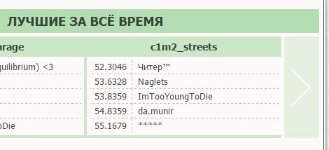 чувак, ты сумасшедший. %) Но благослави тебя Антиквар, на серваке таких не хватает).... и прошло почти 2 с половиной года. На днях побил наконец-таки рекорд карты на карнавале и ответственно заявляю - преимущество дают в основном отшлифованные траектории (ну и отсутствие столкновений само собой, кроме лесенки). А подьём боком на последней конечно даёт выигрыш, но далеко не такой жирный - думаю где-то в районе от половины секунды до секунды
