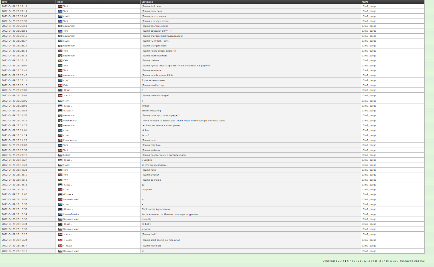 Спасибо за скриншоты. Я не против, может кто записал демо и посмотрим. Голосовой у меня всегда отключен, отвлекает сильно. За чат ничего не скажу, но видно, что ничего нету.Наглядно,кстати,показан ее уровень "коммуникации" с другими игроками.)4 сервер, время на скрине. В чате предупреждений не было с ее стороны, возможно они прозвучали в голосовом чате (Я специально вставил скрины следующих страниц записи чата, там ее сообщений нет). Малинка пишет, что тебя просили слить плеву, от тебя ноль реакции. Совесть записывает демки, наверняка есть запись и твоего инцидента. Если есть что-то добавить - держи в курсе