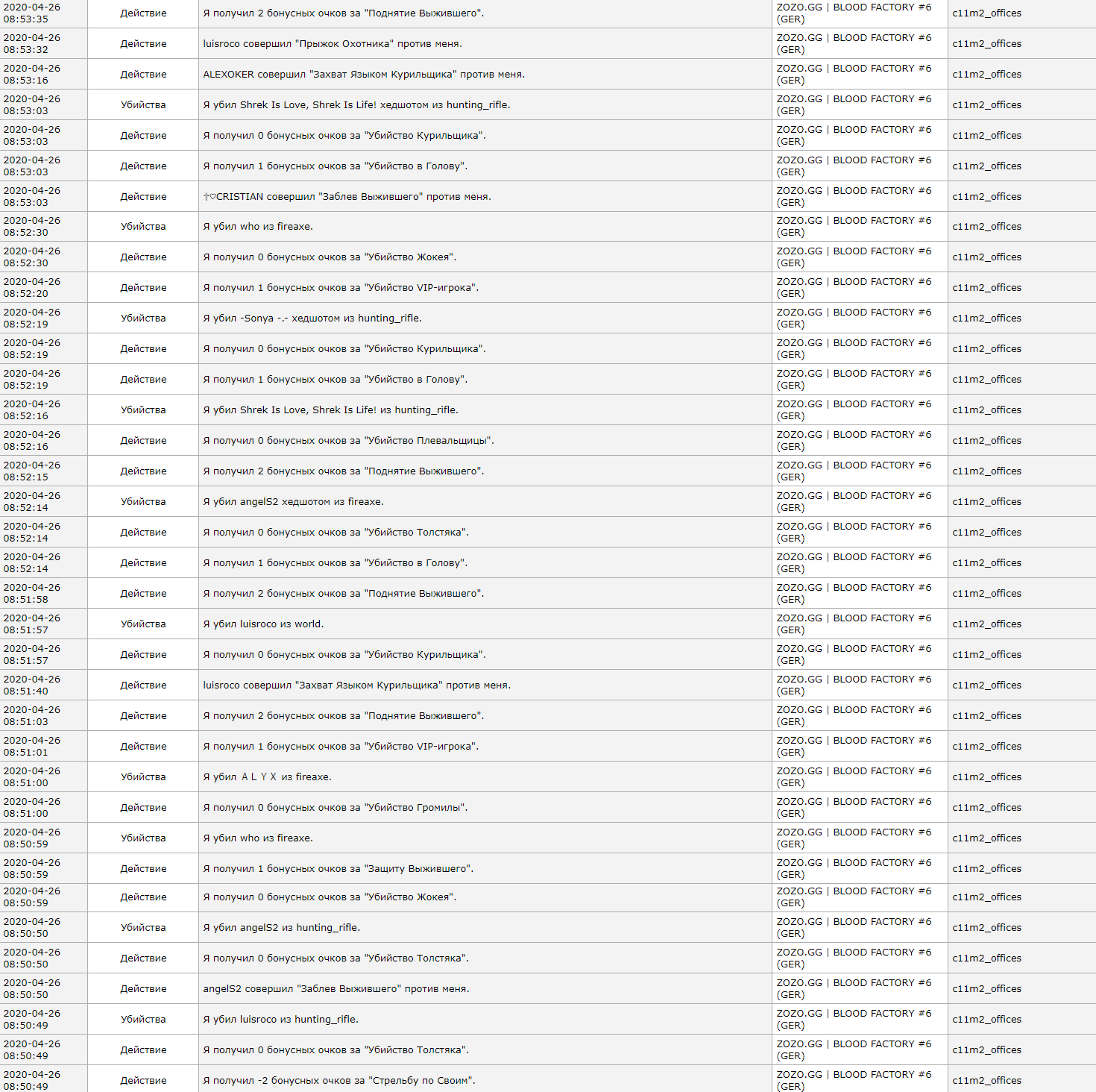 4. [01:20] — повиснув на краю крыши и будучи заблёванным, наш герой прицельно стреляет по Курильщику. И снова видим сообщение о выводе из строя в килфиде, поэтому обращаемся к статистике: запись от [08:51:57] — Я убил luisroco из world. Скриншот статистики прилагается в конце сообщения.