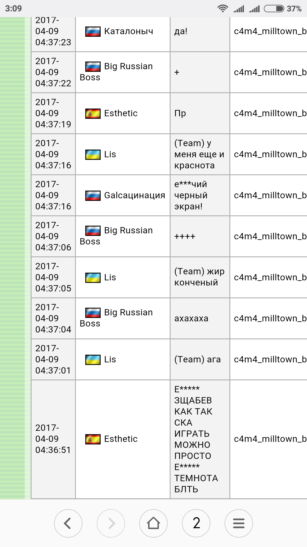 А если мне надо играть на этих серверах а не на других?Однако странные люда играют на серверах зо-зо. Вас как будто заставляют играть на серверах с черным заблевом. Зачем играете, если не нравится? Есть как минимум 3 сервака с "детским" заблевом. Но нет же, надо заходить на 2,4,6 сервера и не довольствоваться. Железная логика!