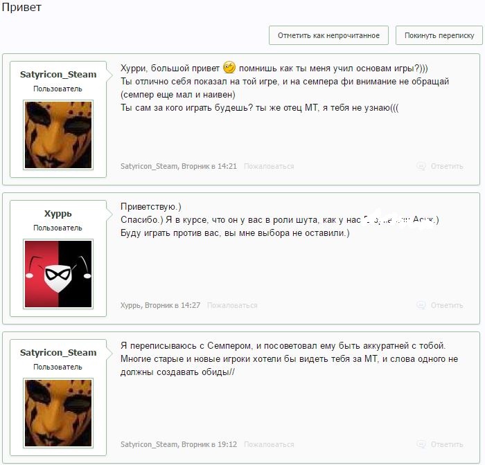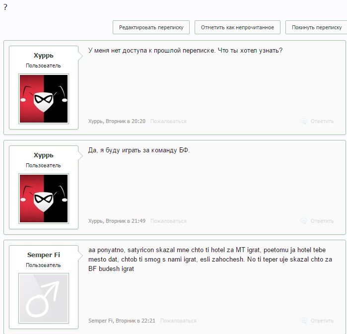 Потом Он предлагает мне место в Его команде (получив отказ, Он агрится на следующий же день - "xuppu down"). Пруфы в приложенных изображениях (Сатирикон, ты же не будешь против, если я опубликую часть нашей с тобой переписки и слегка замажу кое-какие имена?). И нет, я вовсе не собирался участвовать в прошедших и грядущих играх на стороне МТ, особенно после всего запущенного не только в мою, но и в сторону всех игроков БФ дерьма.