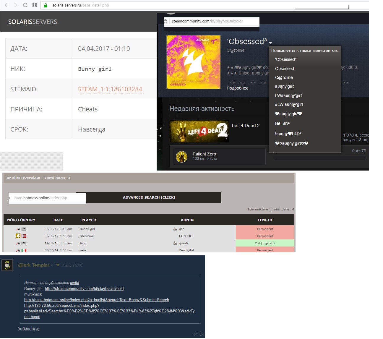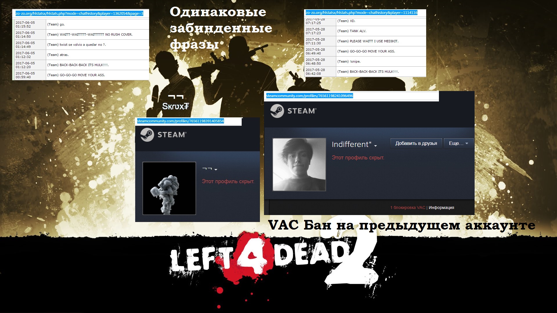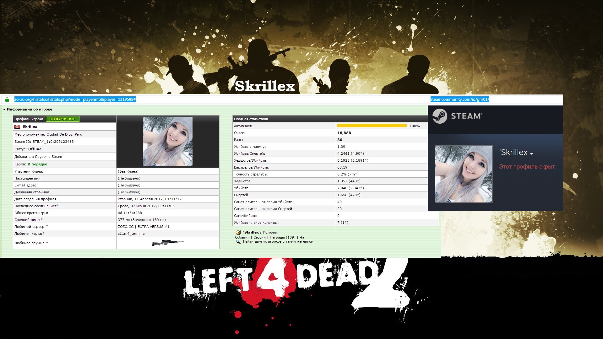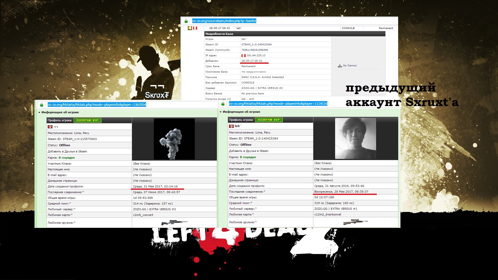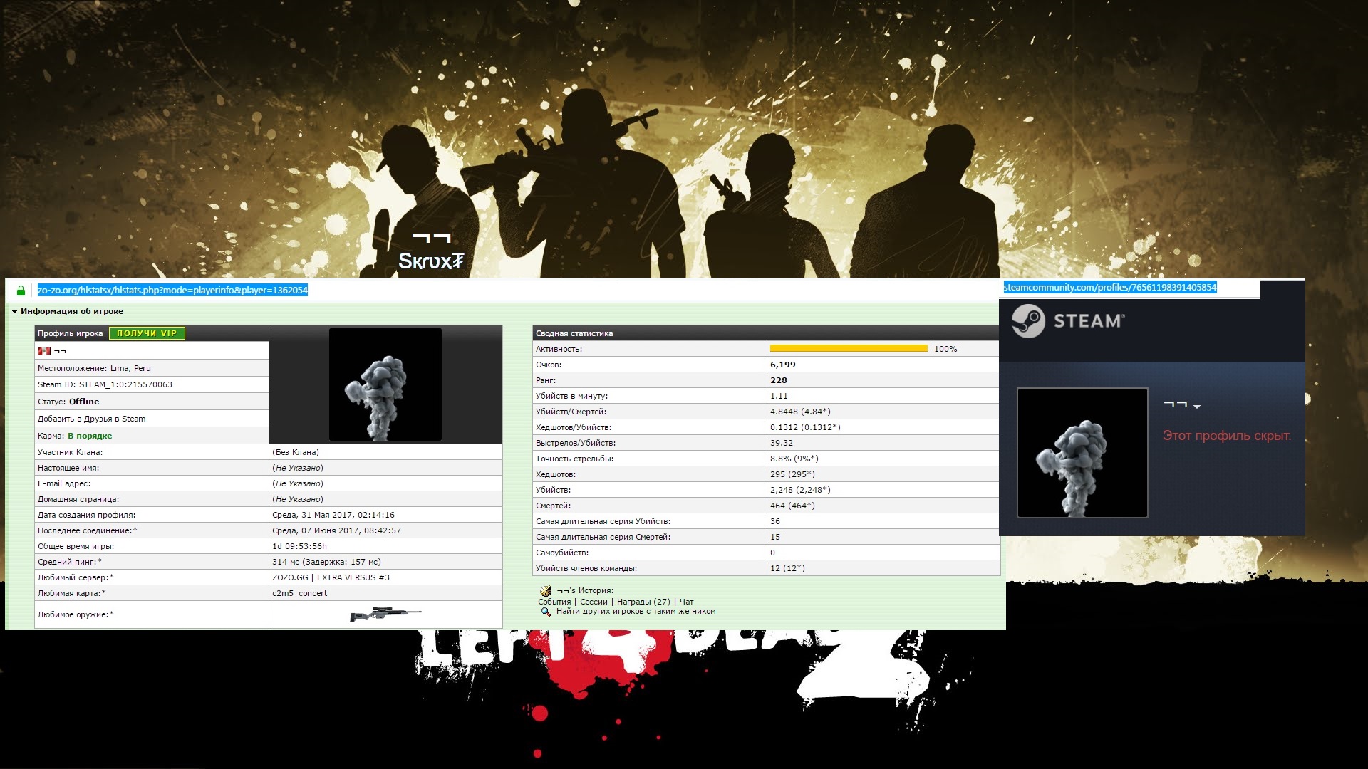 Перейдя по ссылке выше, вы окажетесь на страничке статистики главного героя демки, который спалился с wallhack'ом. Его основной ник - Sқɾʋҳ₮. Забавно, видимо чтобы сильно не светиться, он также играет под стандартными, "нубскими" никнеймами - [SFK]Player и by FreeTP.Org. Также на странице статистики Sқɾʋҳ₮'а вы можете увидеть как его Steam ID (STEAM_1:0:215570063), так и ссылку на его профиль в стиме: https://steamcommunity.com/profiles/76561198391405854