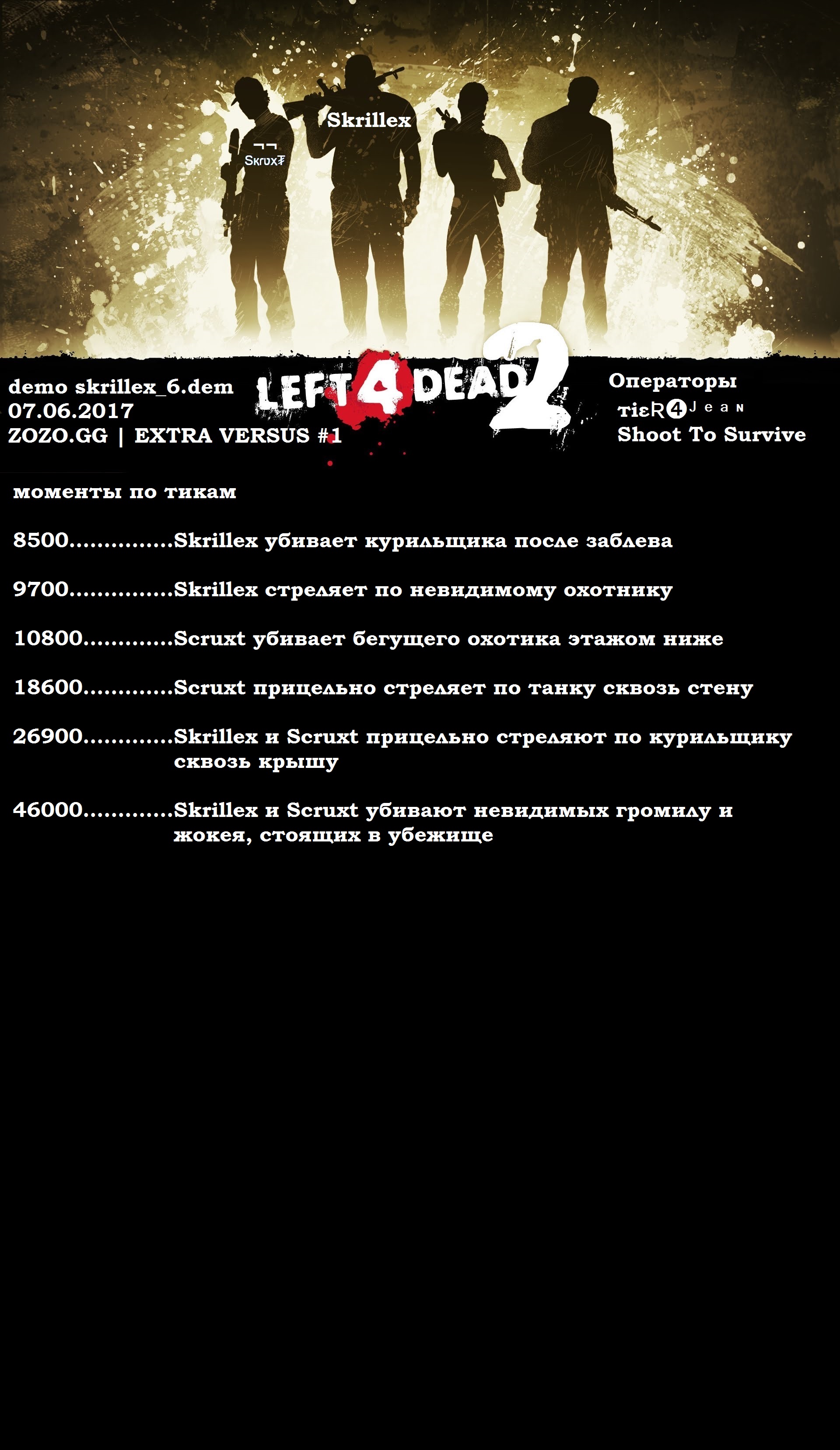 Конечно, делая подобные заявления, неплохо бы предъявить какие-то доказательства. И теперь их есть у меня. Моему товарищу, также ветерану Extra Versus, удалось заснять очень удачную демку, где 100% палится с wallhack'ом один из перуанской читерской банды. В то же время, когда писалось демо, я играл на том же самом сервере. Но в команде читера, за выживших - то есть сам я писать демо "от первого лица", с видом "из глаз" перуанца не мог