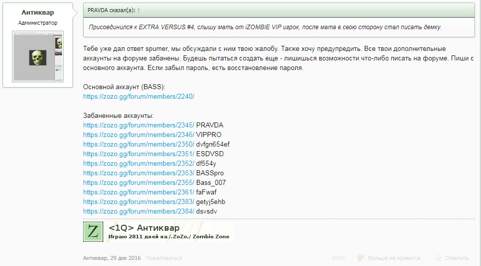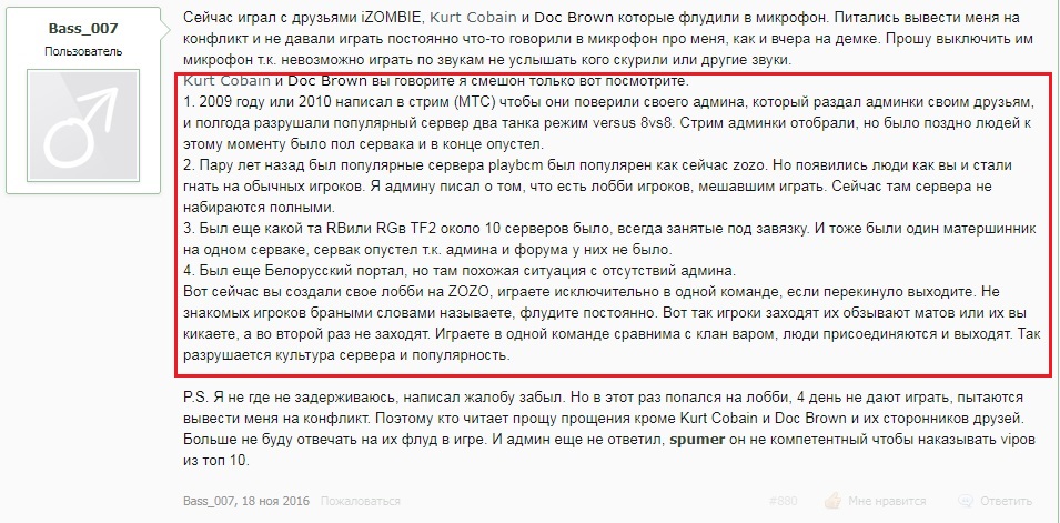 Почему нет ответа администрации? Почему человек продолжает сыпать оскорблениями даже на форуме. Почему неадекват, заслуживающий перманента, до сих пор не наказан. У нас выборочная система наказаний или означает ли это, что если я так же буду вести себя в игре, мне тоже ничего не будет? Антиквар? Спумер?