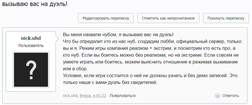 Короче рассказываю про то, какой я трус :). Это чудило на иную букву nick.uhd/nick86pro полезло в условиях строжайшей тайны (чтобы никто не узнал и без демок) звать меня на дуэль